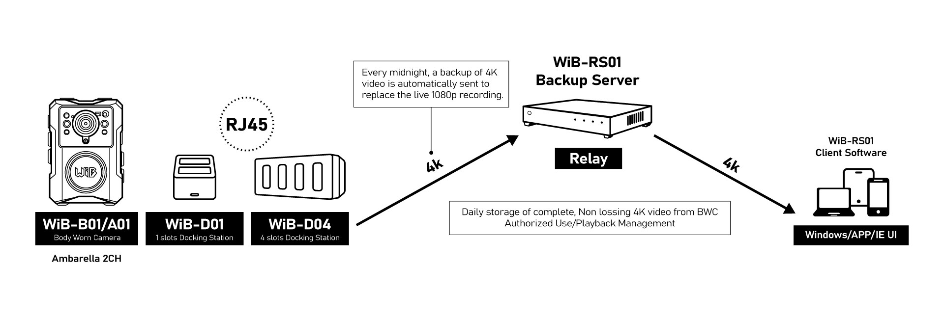 We offer 1-port and 4-port network docking stations (WiB-D01/D04) designed to charge the B01/A01 while capturing its recorded 4K audio and video for local storage. Recorded Video/Audio is automatically uploaded from the network docking station to the WiB-RS01 via an RJ45 connection every day at 00:00 (or manually at any time). This high-quality 4K footage replaces the lower-resolution 1080p files previously transmitted via live streaming.